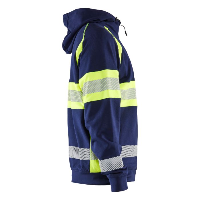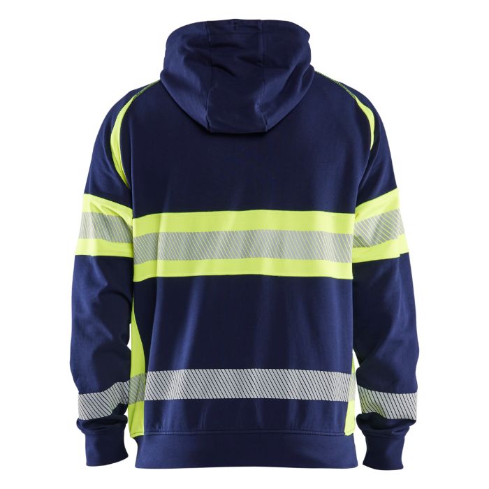 Zachte en comfortabele High Vis hooded sweater van een mooie kwaliteit katoen. Heeft gesneden transferreflectie voor extra rekbaarheid en ademend vermogen. Zakken aan de zijkanten, hoge kraag, hele ritssluiting aan de voorkant en manchetten aan de onderkant en mouwuiteinden voor meer comfort. Het donkere gedeelte van de trui bestaat uit 100% katoen en het High Vis gedeelte is gemaakt van 100% polyester. Gecertificeerd volgens EN ISO 20471, klasse 1