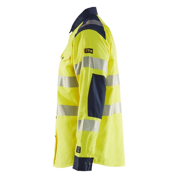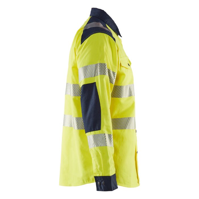 Vlamvertragend en metaalvrij Multinorm-overhemd met High Vis klasse 2 en klasse 3 vanaf maat M. Het overhemd is gemaakt van een stof die garant staat voor een zeer comfortabele pasvorm en bewegingsgemak. Gecertificeerd volgens EN 1149-5, EN ISO 11612 A1, A2, B1, C1, EN ISO 20471, XS-S Klasse 2, M-> Klasse 3, IEC 61482-2, Klasse 1. ATPV 8,5, cal/cm²